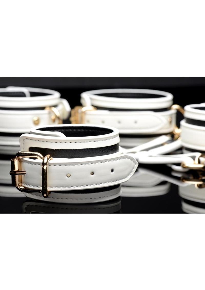 Add a kinky glow to your bedroom bondage fun! This Glowing Hog Tie Set makes it easy to tie your lovers limbs behind their back so you can enjoy their body to your hearts content. The white PU Leather and golden metal hardware add an elegant touch!
