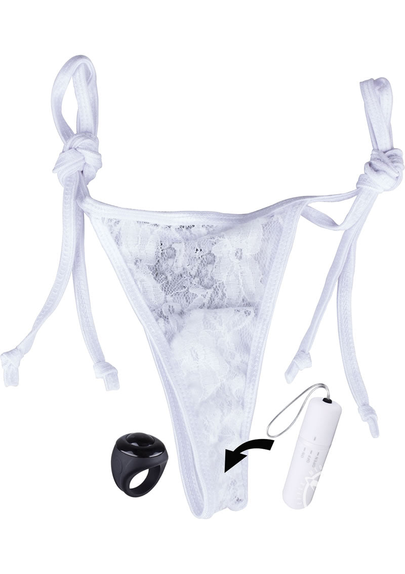 Put the power of pleasure into shoppers' hands with My Secret Vibrating Panty Set, a super-powered vibrating bullet that fits discreetly into a side-tie lace panty to keep it perfectly in place. Operated by a remote control disguised as a finger ring, the My Secret Vibrating Panty Set works from up to 50 feet away makes it fun and easy for couples to play in public. When worn in the panty's pocket, the powerful Bullet sits comfortably against the body and buzzes with 10 different vibration functions designed to tease, please and make her plead for more. Discreet enough to wear under clothing and out on the town and sexy enough to match with any lingerie, the My Secret Vibrating Panty Set is a sexy solution for spicing up any sex life!