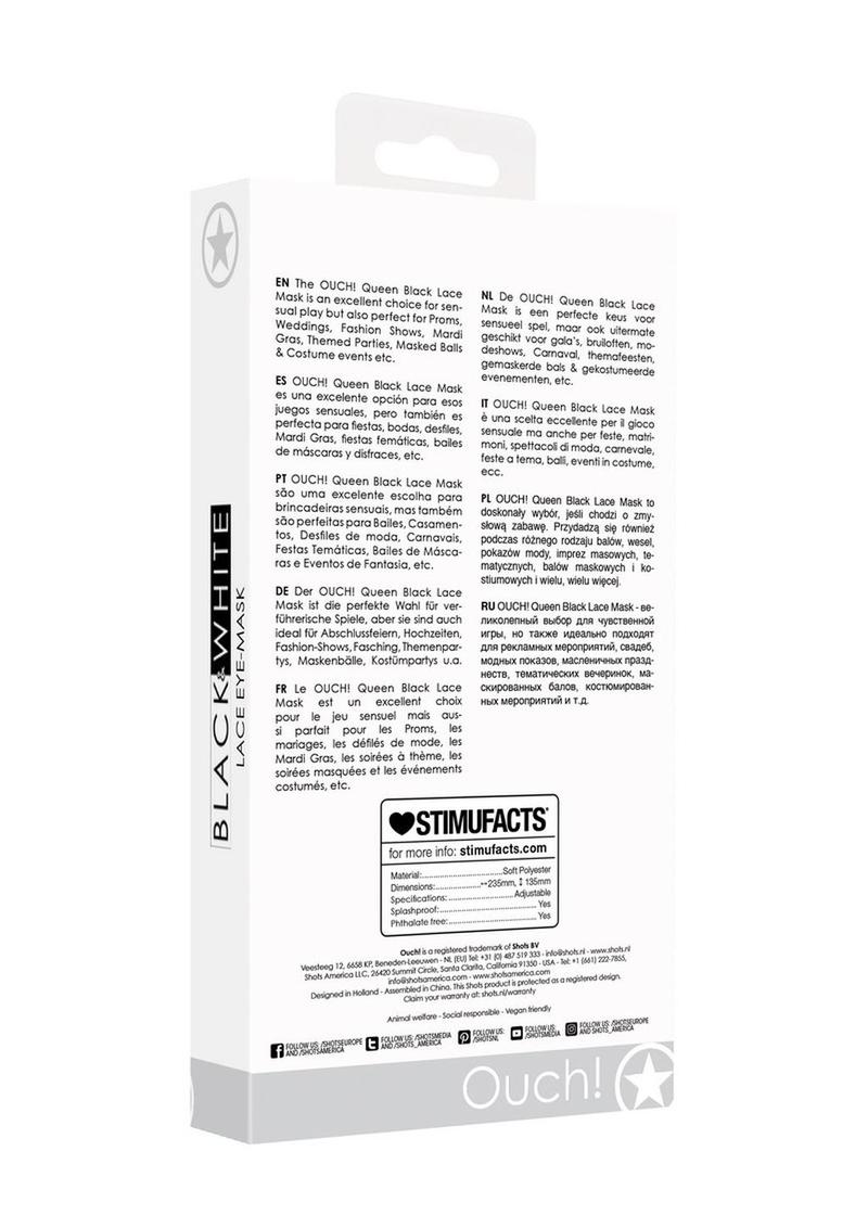 OUCH! Presentb s a series of 4 handmade, high quality, lightweight and easy to wear masks, detailed with intricate modern Venetian inspired designs. Created with laser-cutting technology from the finest, eco-friendly materials, these masks will really give you an air of seductive mystery! Two quality ribbons will secure the mask in place for long hours of comfortable wear or play and facilitate easy adjustment. The OUCH! Queen Black Lace Mask is an excellent choice for sensual play but also perfect for Proms, Weddings, Fashion Shows, Mardi Gras, Themed Parties, Masked Balls & Costume events etc.