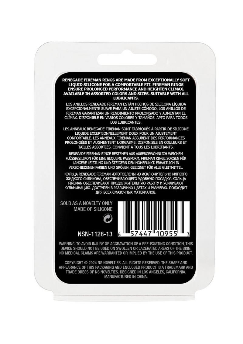 Renegade Fireman Rings are made from exceptionally soft liquid silicone for a comfortable fit. Fireman rings ensure prolonged performance and heighten climax. Available in assorted colors and sizes. Suitable for use with all lubricants including silicone. Waterproof Rating - IPX8.